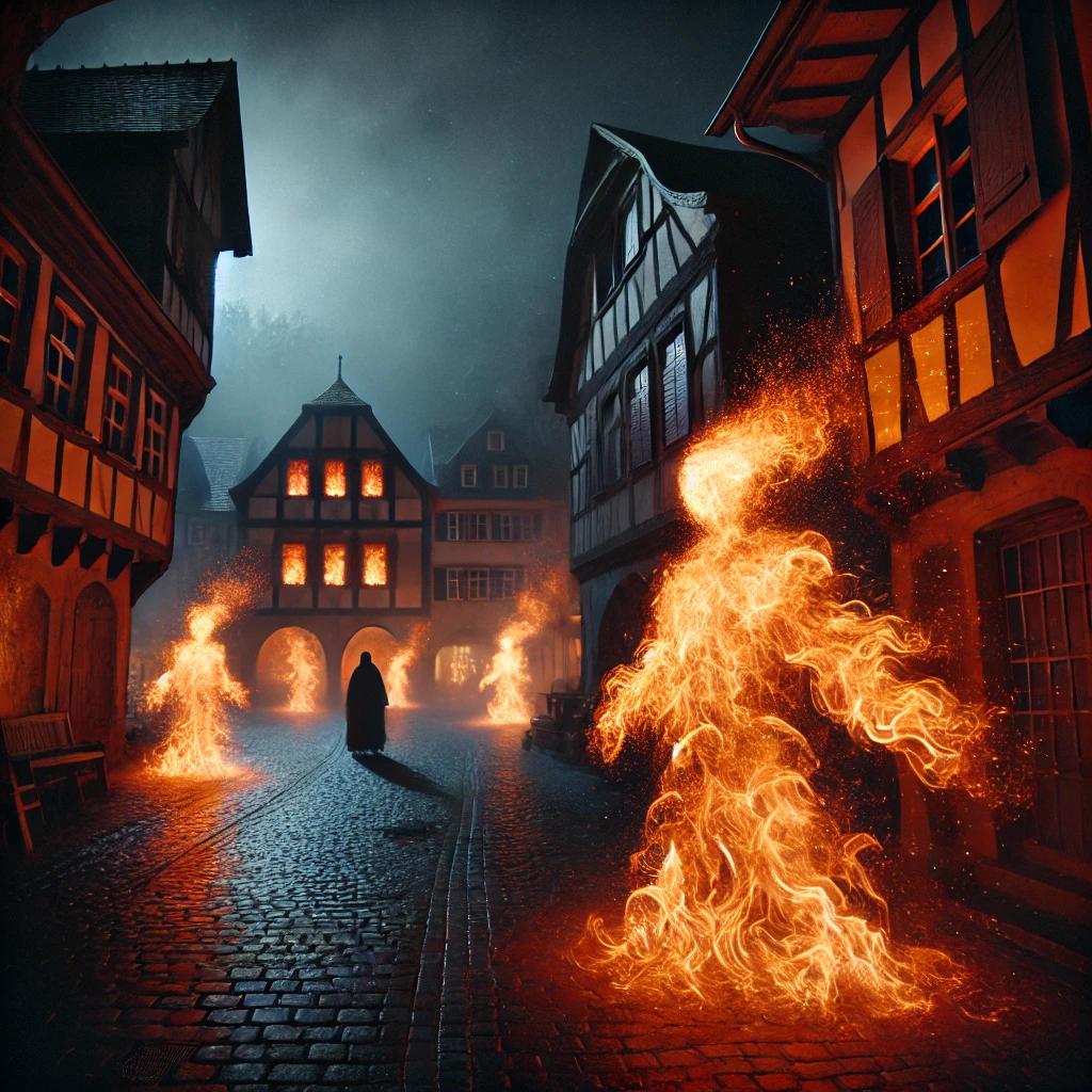 In der Nacht nach der Verbrennung, als die Stadt in Dunkelheit lag, entfachte er neue Flammen. Nicht als zerstörerisches Feuer, sondern als leuchtende, tanzende Gestalten aus Glut und Funken, die durch die Straßen wirbelten. Die Bürger fürchteten sich zunächst, doch bald erkannten sie, dass keine Gefahr von den Wesen ausging. Stattdessen brachten sie Licht in die dunklen Gassen und erinnerten an das Vermächtnis der Frau, die einst verbrannt wurde.